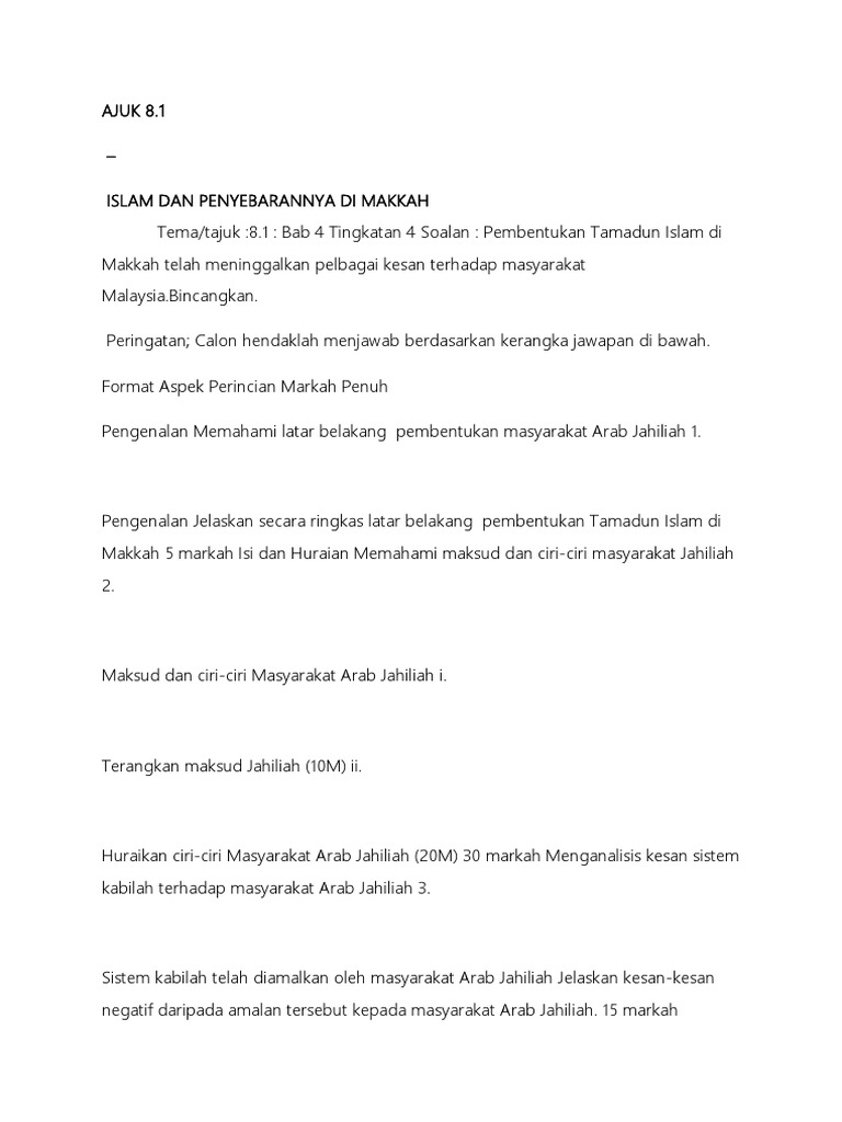 Sejarah Paper 3 Introduction To Law Ilw1501 Studocu from d20ohkaloyme4g.cloudfront.net Pedagang dan bangsawan kerajaan nusantara biasanya adalah yang pertama mengadopsi agama islam. Bahkan kesempatan menyebarluaskan islam di sini semakin tinggi dengan kekuatan dan keamanan yang lebih kuat. Dalam melakukan penyebaran islam ini banyak sekali hambatan yang dihadapi rasullah saw. Intisari pendidikan islam di makkah adalah ajaran tauhid yang menjadi perhatian utama rasulullah. Dalam sejarahnya, penyebaran agama islam di indonesia berlangsung secara cepat. Contoh jawapan esei sej t4. Penyebaran islam di makkah dilakukan. Dalam memberikan pembinaan umat islam di makkah, ada dua bidang pokok yang digarap oleh rasulullah, yaitu:
