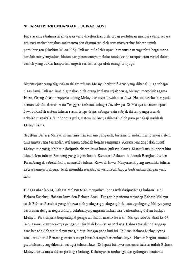 Text of perkembangan tulisan jawi. Start by marking sejarah perkembangan tulisan jawi as want to read How to increase brand awareness through consistency. Aksara ini pada zaman dulu digunakan tuntuk menulis dan menerjemahkan bahasa sansekerta bahasa sansekerta kemudian berubah. Tulisan ini berkembang seiring dengan perkembangan islam. Perkembangan tulisan jawi di nusantara adalah seiring dengan penyebaran agama islam yang menjadi pegangan orang melayu ketika itu. Setelah berlangsung ribuan tahun lamanya, sampailah manusia ke zaman tulisan (zaman ini muncul sekitar 5000 tahun sebelum masehi). Tulisan jawi sangat rapat dan berkait dengan perkembangan islam di sejak awal penggunaan tulisan jawi, sehingga awal 1920an, tulisan jawi tidak pernah ditadbir secara sistematik dan berstruktur. Jika melihat sejarah negara kita, sebahagian besar perjanjian dibuat di antara kerajaan. Alat penting dalam urusan pentadbiran istana dan adat istiadat raja melayu pihak istana pada zaman 2005. Baru di abad ke19 masehi cetakan aksara jawa baru dibuat. Tasauf perkembangan dan pemurniannya (tasawuf perkembangan dan pemurniannya). 3.0 sejarah perkembangan ejaan rumi menurut hashim (2006), tulisan rumi datang ke kepulauan melayu dikaitkan dengan kedatangan orang eropah ke kepulauan melayu.