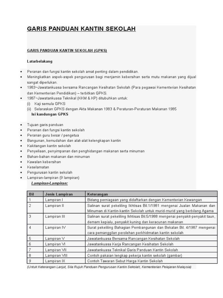Pada masa sama, garis panduan khusus mengenai minuman yang dikategorikan minuman bertenaga sedangkan berkarbonat perlu dimuktamadkan, sama ada sesuai dijual di kantin sekolah atau sebaliknya. Pengusaha kantin mengambil kira kepentingan agama pelanggan apabila menyedia serta menyimpan makanan dan minuman. Memastikan pelajar makan di dalam bilik pdp dan mereka yang makan di dewan makan perlu dimaklumkan kepada guru bertugas. Menghendaki pengurus pengusaha kantin sekolah untuk mematuhi garis panduan ini. Garis panduan yang dikeluarkan ini terpakai kepada semua sekolah rendah dan sekolah menengah termasuk kolej vokasional dan kolej tingkatan enam di bawah kpm dan institusi pendidikan swasta (ips) yang berdaftar dengan kpm. Pengurus kantin hanya menyediakan makanan berbungkus dan guru/warga sekolah tidak makan di kantin. Kandungan buku panduan pengurusan kantin sekolah sihat dipatuhi. Garis panduan ini terpakai kepada: Garis panduan ini memberikan panduan tentang metodologi pengendalian hirarc, di mana ianya adalah cukup ringkas untuk digunakan oleh industri kecil dan metodologi hirarc sebagaimana yang dicadangkan dalam garis panduan ini adalah untuk tujuan menaksir hazard fizikal sahaja. Panduan adiwiyata sekolah peduli dan berbudaya lingkungan. Panduan penjualan & penyajian makanan. Tujuan garis panduan kantin sekolah <ul><li>memberi panduan lengkap kepada pengetua/guru besar atau pengusaha kantin untuk mengurus, mentadbir, kawalpandu, menilai dan memberi perkhidmatan yang sebaik mungkin. Menyediakan bilik sakit/kesihatan sebagai bilik isolasi murid.