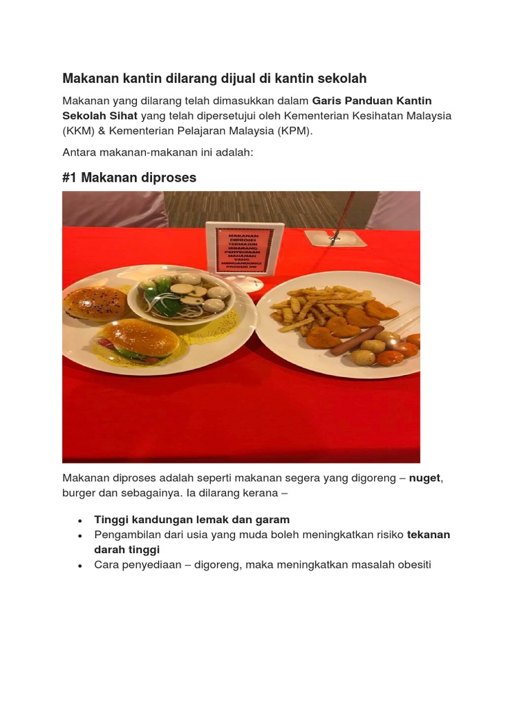 Menghendaki pengurus pengusaha kantin sekolah untuk mematuhi garis panduan ini. Panduan penjualan & penyajian makanan. Kpm juga memaklumkan bahawa sekolah yang berdaftar dengan. Panduan adiwiyata sekolah peduli dan berbudaya lingkungan. • menggariskan kaedah pemantauan pelaksanaan garis panduan ini dan. Garis panduan kantin sekolah juga menyenaraikan makanan yang sesuai dijual di kantin sekolah, di samping tahap keselamatan dan kebersihan yang perlu diamalkan oleh pengusaha kantin. Tujuan garis panduan kantin sekolah <ul><li>memberi panduan lengkap kepada pengetua/guru besar atau pengusaha kantin untuk mengurus, mentadbir, kawalpandu, menilai dan memberi perkhidmatan yang sebaik mungkin. Garis panduan ini memberikan panduan tentang metodologi pengendalian hirarc, di mana ianya adalah cukup ringkas untuk digunakan oleh industri kecil dan metodologi hirarc sebagaimana yang dicadangkan dalam garis panduan ini adalah untuk tujuan menaksir hazard fizikal sahaja. Pengurus kantin hanya menyediakan makanan berbungkus dan guru/warga sekolah tidak makan di kantin. Semua ssekolah menengah termasuk kolej vokasional dan kolej tingkatan enam di sekolah perlu memastikan pengusaha kantin hanya menyediakan makanan berbungkus. Garis panduan pengurusan makanan dan minuman.pekeliling bahagian pengurusan dan kementerian kemajuan luar bandar dan wilayah malysia • kementerian kesihatan malaysia.(2009). Garis panduan pembukaan semula sekolah. 3 jawatankuasa kantin sekolah setiap sekolah yang mempunyai kantin, dikehendaki menubuhkan jawatankuasa kantin sekolah.